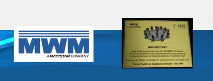 O evento do PRÊMIO PAULISTA DE QUALIDADE DA GESTÃO, ocorrido no último dia 09, consagrou o case da MWM “UTILIZAÇÃO DAS TÉCNICAS DE LEARNING REVIEW E AFTER ACTION REVIEW COMO FERRAMENTAS PARA ALAVANCAR O DESENVOLVIMENTO DE SOLUÇÕES PRÁTICAS EM PROJETOS LEAN”. Este estudo fomenta a importância do Lean Manufacturing dentro das empresas que procuram o aumento de eficiência produtiva através de práticas de melhoria contínua e foco em eliminação de desperdícios, práticas adotadas pela MWM com grande sucesso.