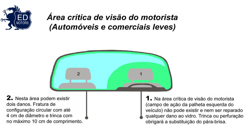 Com essa finalidade, para-brisa com trinca ou perfuração na área crítica de visão do condutor ou na faixa periférica de 2,5 centímetros de largura nas bordas externas deve ser substituído. Área crítica de visão é a faixa de varredura do limpador de para-brisa à frente do condutor.