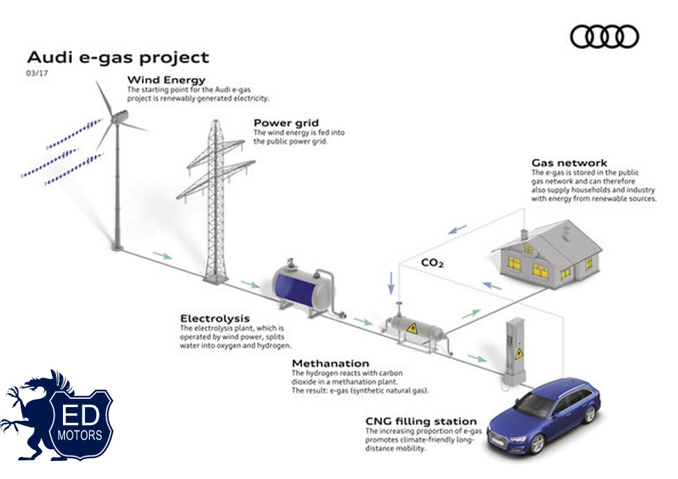 A Audi e seus parceiros estão produzindo o Audi e-gas por meio de uma série de processos e equipamentos na Alemanha, assim como em outros países europeus. Entre outros lugares, a marca obtém o e-gas a partir de sua própria instalação de energia em Werlte, cidade localizada no estado da Baixa Saxônia. O processo usa principalmente eletricidade verde para operar três eletrolisadores, que separam o oxigênio e o hidrogênio da água. No processo de metanização que se segue, o hidrogênio reage com CO2. Isso produz metano sintético – o Audi e-gas.