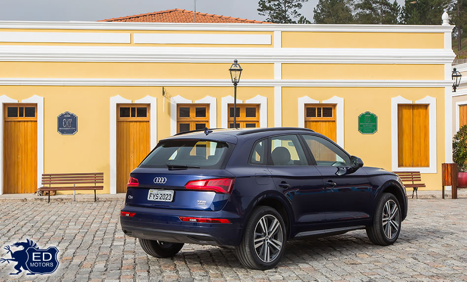 Uma linha de ombro com curvas distintas e com recortes reforçados dão estrutura à lateral do veículo. Os arcos das rodas pronunciados fazem uma referência ao sistema de tração integral quattro. Assim como na dianteira, linhas horizontais na traseira transmitem uma imagem de largura e presença. As lanternas com luzes direcionais dinâmicas são de série na versão Ambition. A tampa traseira envolve as colunas C – uma característica típica dos modelos da família Q. Um difusor de ar integra as saídas de escapamento.