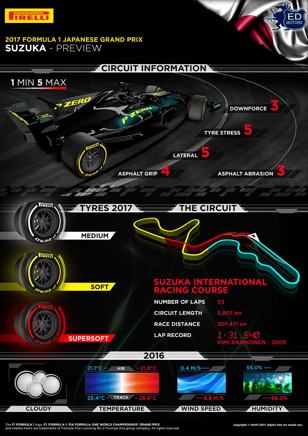 Suzuka(Japão), um circuito épico e da velha guarda, é conhecido por ser um dos maiores desafios para os pneus no calendário, graças às altas cargas de energia a que são submetidos. Mesmo assim, pela primeira vez a Pirelli não levará seu pneu mais duro para o Japão. Os compostos selecionados são o P Zero Branco médio, o P Zero Amarelo macio e o P Zero Vermelho supermacio. Eles terão que lidar com curvas extensas e velozes, como a 130R, que proporciona a mais longa carga contínua de Força G do ano, e a Spoon, que colocam os pneus sob constante pressão. Com voltas de corrida até cinco segundos mais rápidas que as registradas em 2016, um grande salto também é esperado em Suzuka. Uma vasta gama de opções de estratégias está disponível. A questão é encontrar a que ofereça o melhor equilíbrio entre performance e durabilidade.