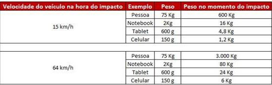 O especialista ainda lembra que o passageiro sem cinto no banco traseiro, em caso de colisão, pode ser arremessado sobre o motorista e o carona com uma força 50 vezes maior do que o seu peso. Veja na tabela abaixo:
