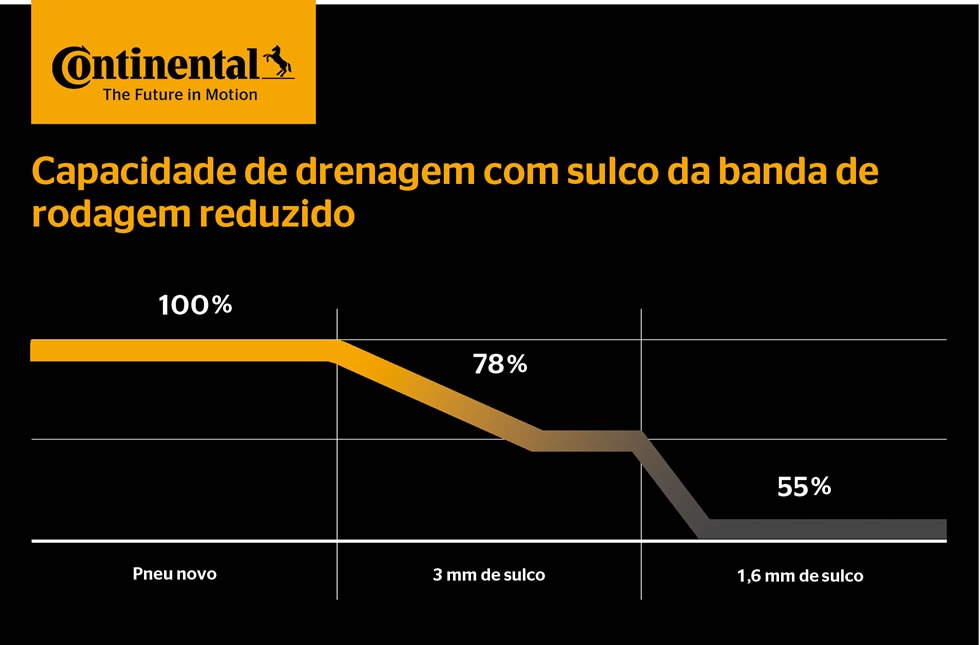 Um estudo conduzido pela Continental apurou que pneus novos, com 100% de sua capacidade de dispersão, podem dar vazão a até 30 litros de água por segundo a uma velocidade de 80 km/h. Mas, quando os sulcos atingem o limite legal de 1,6 mm essa capacidade cai para 55%, o que impacta diretamente a dirigibilidade e a segurança. No teste foram utilizados pneus de diversas marcas na dimensão 205/55 R16H rodando sobre uma pista molhada (9 mm de água).
