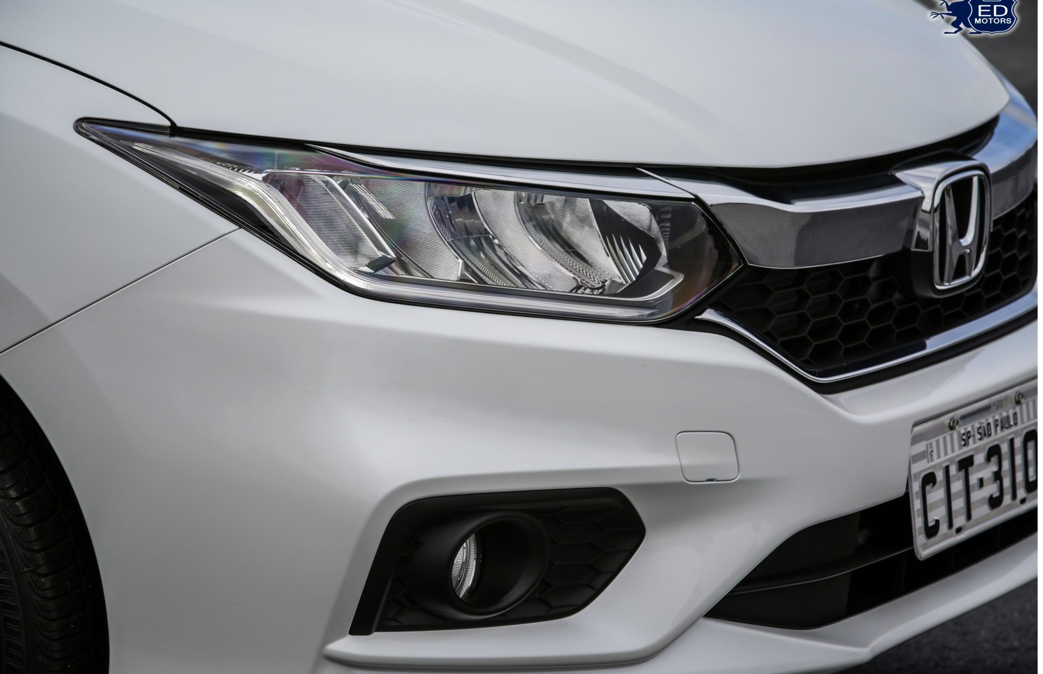 A nova grade frontal traz design inédito que avança sobre os faróis, trazendo o logotipo da Honda destacado e ampliado ao centro. Os faróis também são novos e trazem luzes de rodagem diurnas em LED integradas de série, em todas as versões do City.