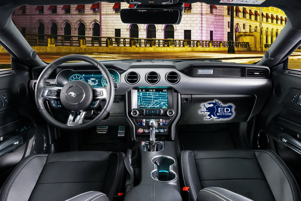 Os bancos esportivos de couro, com aquecimento e refrigeração, proporcionam ótima retenção e conforto tanto nas pistas como para uso diário. O botão de partida que pulsa no mesmo ritmo do coração de um cavalo e a luz de aproximação nos retrovisores com a projeção do ícone do Mustang no chão são outros charmes exclusivos do “pony car”.