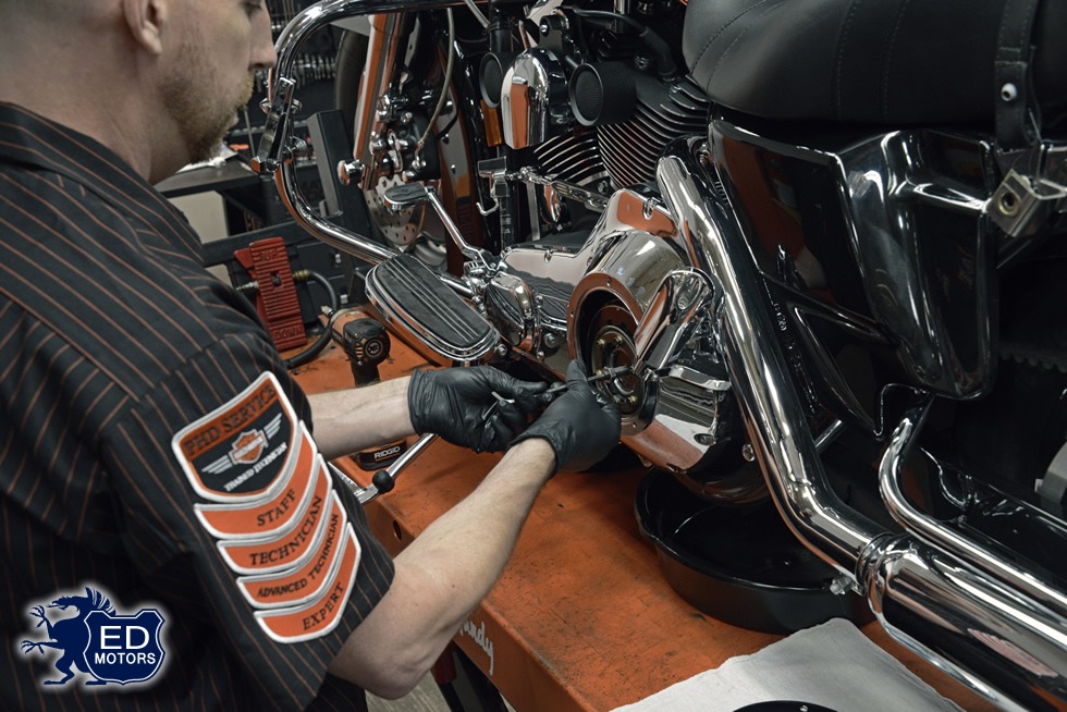 Para a manutenção dos sistemas hidráulicos de embreagem são utilizadas técnicas similares às da manutenção do sistema de freio, já que o fluído deve ser inspecionado em relação ao nível do reservatório e a substituição deve acontecer a cada dois anos. Para os sistemas mecânicos, a manutenção inclui, também, a lubrificação do cabo de acionamento e ajuste do parafuso de regulagem, de acordo com a folga especificada no manual de serviço da H-D. Em ambos os casos, é necessária a substituição do óleo de todo o conjunto primário a cada 16 mil quilômetros.
