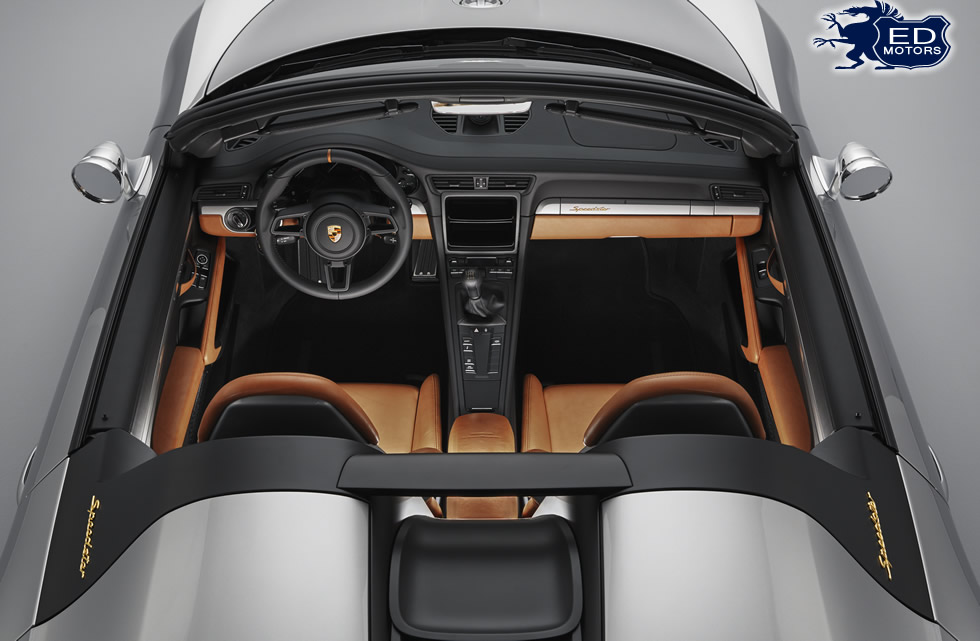 Como seu original histórico, o 911 Speedster Concept também apresenta uma cobertura leve tipo “tonneau” (horizontal), em lugar de uma capota conversível. Essa cobertura protege o interior do carro da chuva quando estacionado e é fixada por oito presilhas Tenax. Os princípios de baixo peso da filosofia Speedster continuam no interior, onde os sistemas de navegação, rádio e ar-condicionado foram todos eliminados. Os bancos integrais tipo concha são feitos de carbono e a cobertura de couro marrom claro Aniline na cor Cognac 356 empresta ares de seus clássicos antecessores.