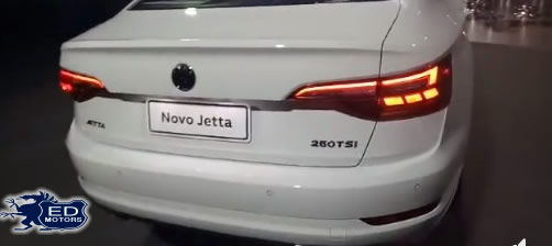 Traseira. O estilo da seção traseira é definido pelos traços que vão da tampa do porta-malas e se estendem até a linha de ombro, formando uma terminação aerodinâmica da tampa do porta-malas. O defletor (spoiler), que é integrado ao design da tampa do porta-malas, conecta-se com as linhas das extremidades das laterais, enfatizando a largura do sedã. Essa largura também é evidenciada pelas linhas das lanternas traseiras de LED, que conferem ao Novo Jetta uma identidade visual noturna única. Com foco na sofisticação, a parte inferior do para-choque conta com detalhes cromados.