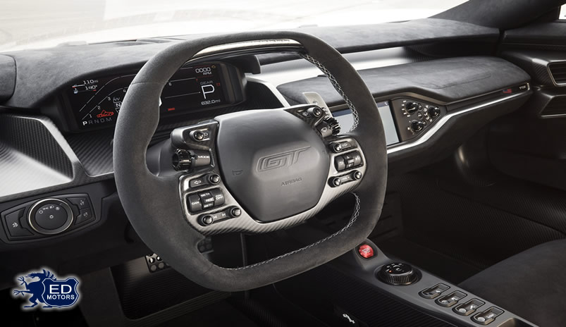 Na cabine, o Ford GT Carbon Series exibe fibra de carbono nas soleiras, comandos de ar e console central. Ele também tem bancos de padrão exclusivo, com costura prateada que é repetida no volante, além de borboletas de câmbio anodizadas e um distintivo exclusivo no painel.
