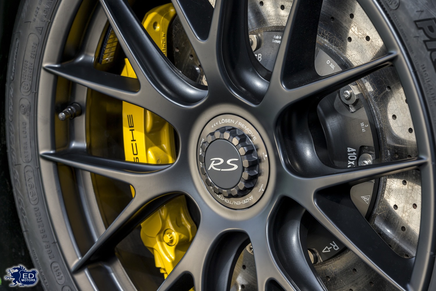 Voltado à performance, o 911 GT3 RS possui teto de magnésio e componentes aerodinâmicos específicos que reforçam a tecnologia de competição incorporada a um carro esportivo homologado para uso urbano. O ajuste do aerofólio traseiro – específico do RS – aumenta a força descendente para um total de 144 kg a 200 km/h, por exemplo.