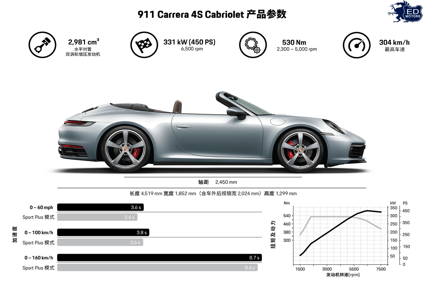 O 911 Cabriolet será oferecido inicialmente nas versões Carrera S, com tração traseira, e Carrera 4S, com tração nas quatro rodas. Ambas contam com um motor boxer de seis cilindros de 2.981 cm³ turboalimentado, com 331 kW (450 cv) a 6.500 rpm e 530 Nm entre 2.300 e 5.000 rpm. A eficiência foi aumentada e as emissões reduzidas através de um processo de injeção aperfeiçoada. Outras medidas de otimização também foram implementadas, como um novo posicionamento para os turbocompressores e do sistema de resfriamento do ar da alimentação. A força é disponibilizada através de uma nova transmissão de dupla embreagem com oito velocidades. O Carrera S acelera de 0 a 100 km/h em 3,9 segundos (com o pacote opcional Sport Chrono, 3,7 segundos) e pode atingir uma velocidade de até 306 km/h. O Carrera 4S atinge uma velocidade máxima de 304 km/h e faz de 0 a 100 km/h em 3,8 segundos (com o pacote Sport Chrono, 3,6 segundos).