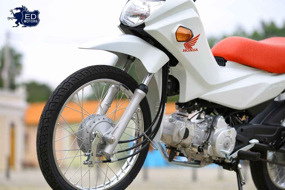 Suspensões robustas – telescópica na dianteira e bichoque atrás – aliadas a um chassi tubular de aço, com rodas e pneus (60/100-17 à frente e 80/100-14 atrás), fazem a Pop 110i surpreender também pela competência com a qual encara as mais diversas situações de utilização, mas que estão plenamente ao alcance da menor das Honda.