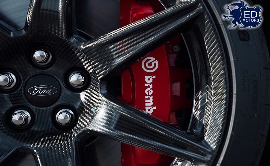 Para despejar toda essa potência no asfalto são usados dois tipos de pneus Michelin, com compostos e bandas de rodagem especiais: Pilot Sport 4S, personalizados da Ford Performance, e Pilot Sport Cup 2. O poder de frenagem é garantido por discos duplos de freio de 420 mm – os maiores de todos os cupês esportivos norte-americanos –, com pinças Brembo maiores e mais rígidas, de seis pistões. Com área de varredura 20% maior que a do Shelby GT350, esses freios têm mais de 30% de massa térmica adicional nas rodas dianteiras.
