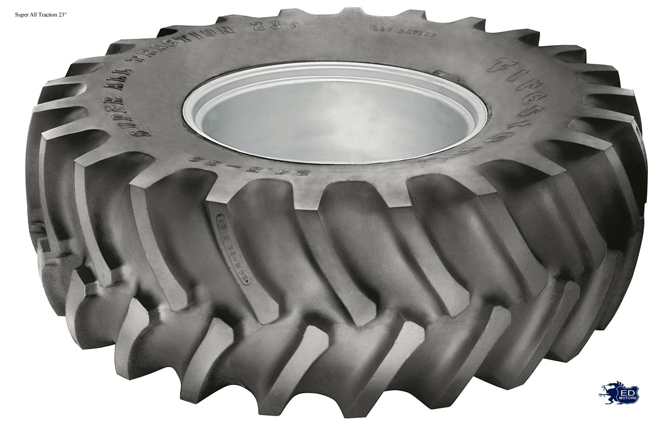 O modelo fornecido é o Super All Traction 23°, nas medidas 23.1-30 e 24.5-32. De classificação R-1, este pneu é indicado para tratores, colheitadeiras e outros equipamentos agrícolas, e foi desenvolvido com barras regulares para uso em terrenos secos e serviços gerais que exijam excepcional tração, maior estabilidade, dirigibilidade e durabilidade.