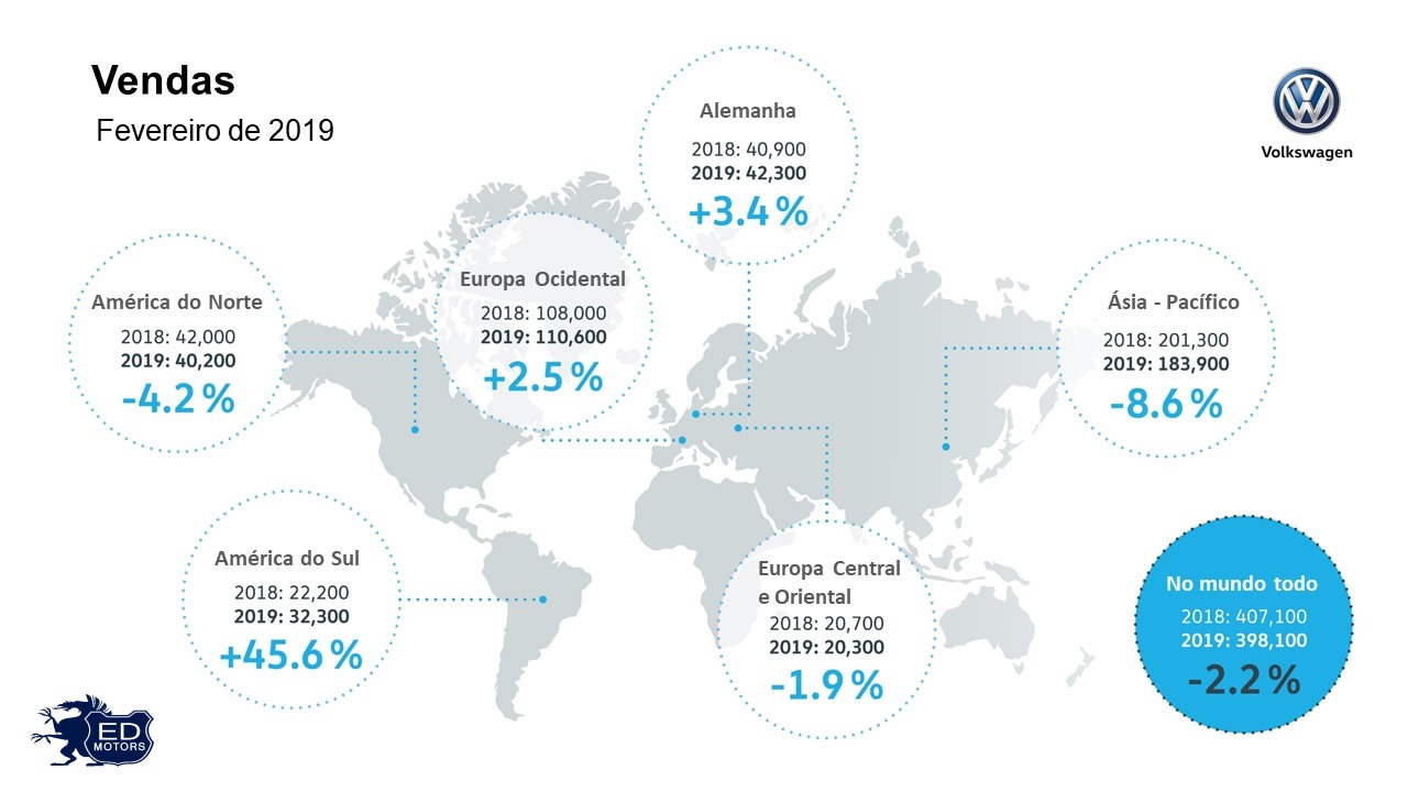 Em fevereiro de 2019, a marca Volkswagen entregou 398.100 veículos em todo o mundo, um resultado 2,2% inferior a fevereiro de 2018. Em um mercado global que encolheu de forma ainda mais expressiva, a Volkswagen conseguiu ganhar market share ao redor do mundo. A marca entregou mais carros na Alemanha (+3,3%), Europa (+1,8%) e América do Sul (+45,6%). Quedas nas vendas foram registradas, porém, na América do Norte (-4,2%) e na China (-8,8%). Apesar da queda, a marca VW também ganhou market share no mercado chinês. (ver mapa abaixo)