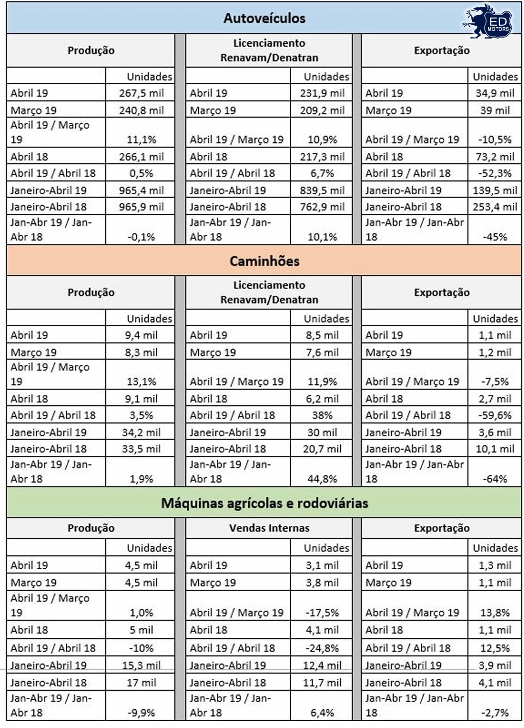 “Estamos crescendo mês após mês no acumulado do ano, o que nos mostra que o mercado automotivo brasileiro está se recuperando dos anos de baixa. Nossas exportações ainda permanecem em queda devido à situação vivida pelo nosso principal parceiro comercial, a Argentina, o que impacta também a produção das nossas fábricas. Fecharemos este ano com uma elevação importante no mercado interno. Os segmentos de caminhões, ônibus e máquinas têm apresentado uma retomada ainda mais expressiva, o que sinaliza o potencial de crescimento dos setores agrícolas e produtivos”.