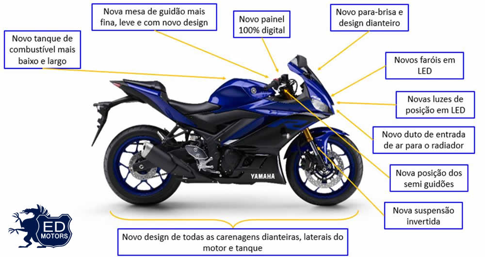 Além das carenagens, também são novidade os faróis e luzes de posição em LED, novo tanque de combustível, nova altura do guidão, painel 100% digital com Shift Light, nova suspensão dianteira invertida e nova mesa superior.
