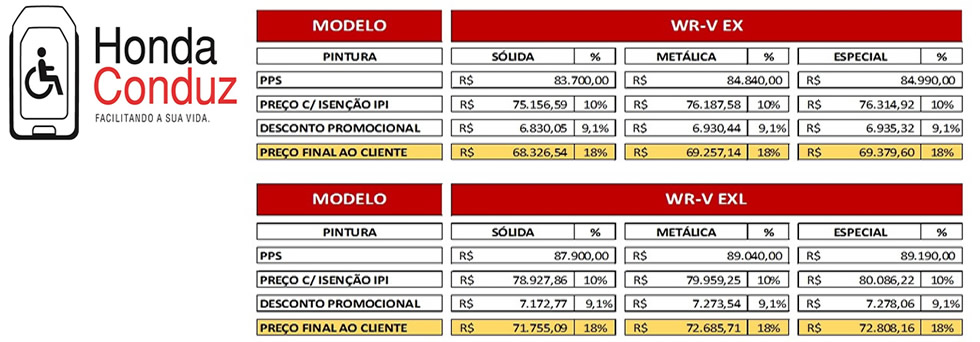 Por meio do programa Honda Conduz, que completa em 2019 o seu 22° ano de existência, a Honda Automóveis do Brasil lança campanha inédita de vendas do modelo WR-V, o SUV compacto da Honda, para aquisição do público PcD. Trata-se de um desconto especial que, somado à isenção de IPI, proporciona 18% de desconto nas versões EX e EXL.