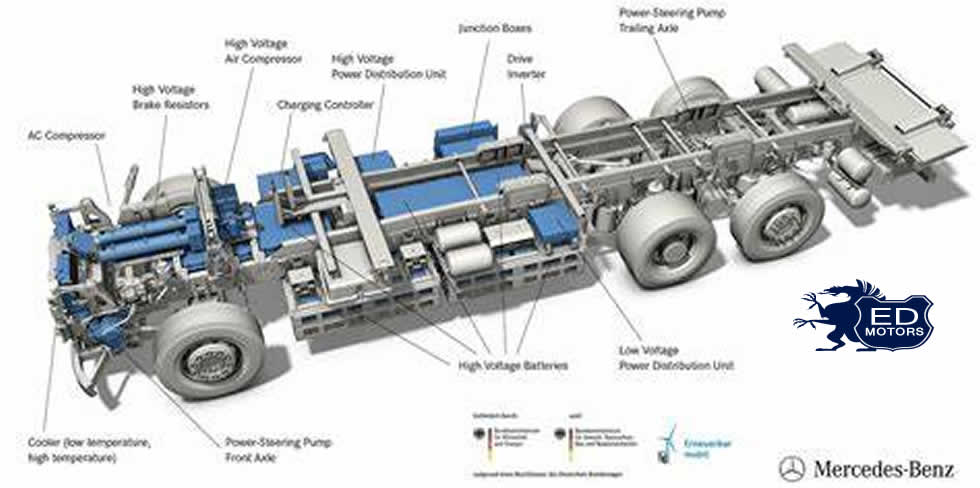 O eActros se baseia no chassi do Actros da Mercedes-Benz. Entretanto, a arquitetura do veículo foi bastante remodelada para o sistema de propulsão elétrica e assim apresenta alta porcentagem de componentes específicos. Dois motores elétricos próximos aos cubos das rodas do eixo traseiro oferecem a força propulsora, cada um disponibilizando uma potência de 126 kW e torque máximo de 485 Nm. Além disso, a relação de transmissão utilizada leva os valores de propulsão a até 11.000 Nm em cada roda. Assim, a força de propulsão se equivale à de um caminhão convencional. Baterias de lítio-íon com capacidade de 240 kWh dão ao eActros a energia necessária. Dependendo da potência disponível para se realizar a carga, as baterias podem ficar 100% carregadas dentro de duas horas (a 150 kW).