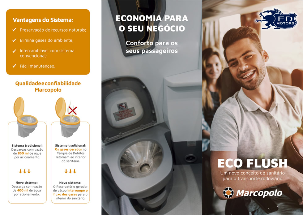 Para oferecer cada vez mais conforto, comodidade, praticidade e funcionalidade para os passageiros e para o operador, a Marcopolo desenvolveu um novo sanitário, o Eco Flush, que inova e garante padrões mais elevados de vedação, com eliminação de odores, eficiência e maior economia de água.