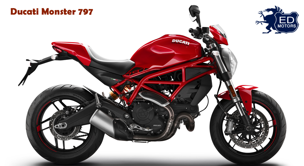 A Ducati Monster 797 tem motor Desmodue L-twin refrigerado a ar que fica acomodado no quadro Trellis, mostrando os componentes mecânicos no inimitável estilo da Monster. Com uma potência máxima de 75 cv a 8.250 rpm e ótimo rendimento na faixa de rotação, a Monster 797 coloca o desempenho e a diversão ao alcance de todos.