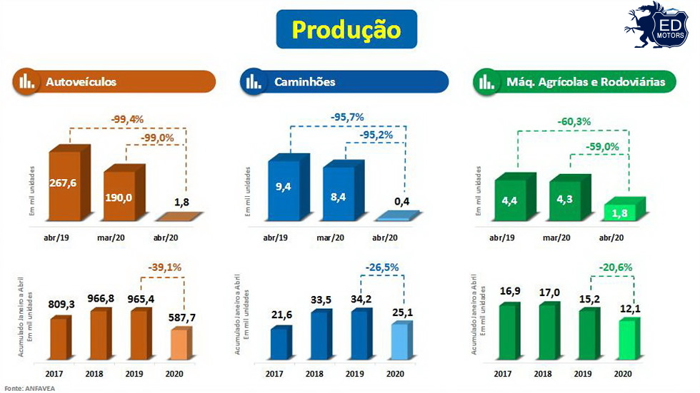 A situação da indústria automobilística é uma das mais difíceis entre todos os setores da economia brasileira. A paralisação em abril de 63 das 65 empresas instaladas aqui (incluindo tratores e máquinas rodoviárias) levou a números incrivelmente baixos: apenas 1.847 veículos leves e pesados produzidos. Um número próximo a fevereiro de 1957 (63 anos atrás) quando o parque produtor mal tinha sido montado e contava apenas com sete fabricantes: Vemag (DKW), FNM, Ford, GM, Mercedes-Benz, Scania e Willys. Havia ainda a Romi (Isetta), fora dos números da Anfavea, por não ser filiada.