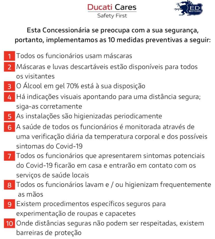 Em São Paulo, por exemplo, a estimativa é que as lojas voltem a funcionar de forma normal durante o mês de junho. Para auxiliar nesta retomada, a Ducati Motor Holding lançou mundialmente o programa Ducati Cares e que agora passa a ser implementado no Brasil.