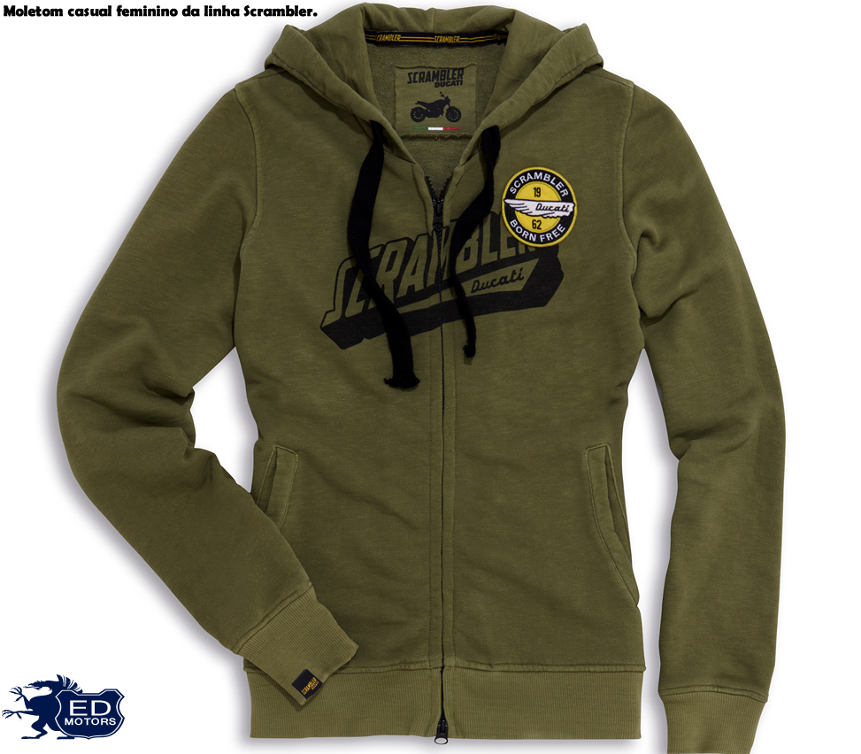 Moleton Casual feminino da linha Scrambler. O modelo possui capuz e corte modelado na versão full zip com forte evocação Scrambler presente nas cores, na estampa frontal e nos patchs de imprescindíveis detalhes amarelos. A peça exclusiva da linha Scrambler é produzida na Itália com 100% algodão flamê. O modelo tem certificação CE (certificada segundo os rígidos padrões da comunidade europeia), podendo ser usado no lazer e na pilotagem urbana, com segurança.