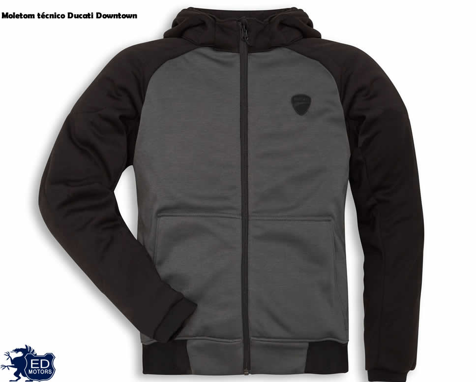 Moletom técnico Ducati Downtown. Feito em moletom de poliéster, mas com toque de sensação de algodão, o modelo tem capuz removível. A peça masculina lifestyle vem equipada com elementos de proteção que são característicos do vestuário motociclístico. O modelo é dotado no seu interior de reforços antiabrasão em fibra de aramida, proteções nos ombros e bolso nas costas para a introdução do protetor de coluna Nucleon (vendido separadamente). Preço sugerido: R$ 1.107,00