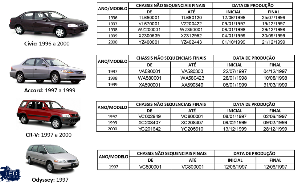 Importante: Esse comunicado se aplica aos veículos Civic modelo 1996 a 2000, Accord modelo 1997 a 1999, CR-V modelo 1997 a 2000 e Odyssey modelo 1997.