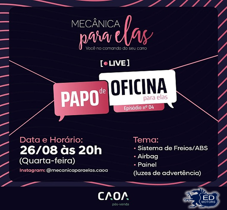 Após o sucesso de audiência das primeiras LIVEs Papo de Oficina para Elas, a CAOA segue utilizando estrutura e conhecimentos obtidos com o curso de mecânica automotiva, Mecânica para Elas – Você no comando do seu carro, para debater e apresentar soluções sobre os principais cuidados com o veículo. A nova LIVE irá tratar de temas extremamente importantes como sistema de airbag, freios e a importância das luzes de advertência.