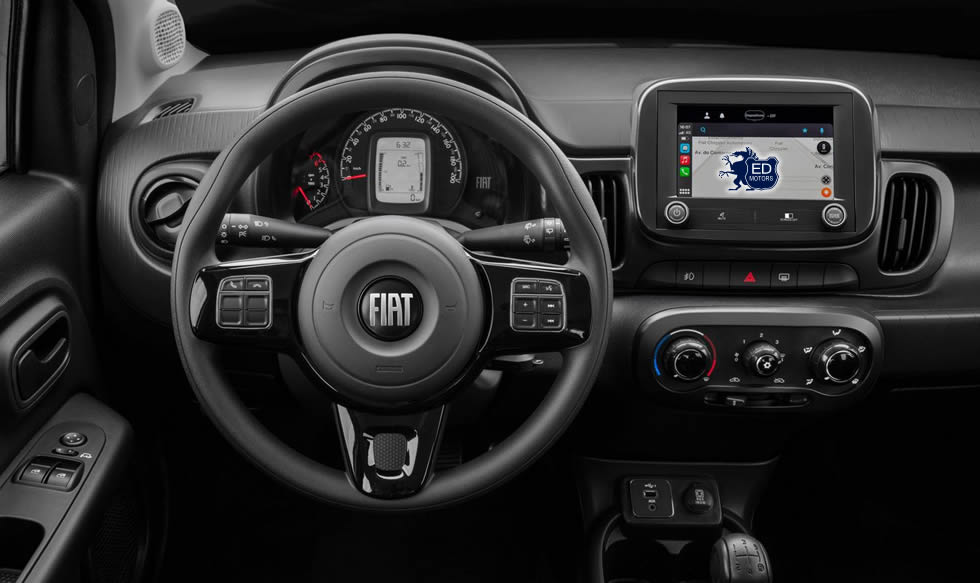 O Mobi 2021 levou também para seu interior a nova identidade da marca. O Logo Script está no centro do volante e na chave. Já a Fiat Flag está presente no revestimento do câmbio, deixando clara a italianidade da marca.
