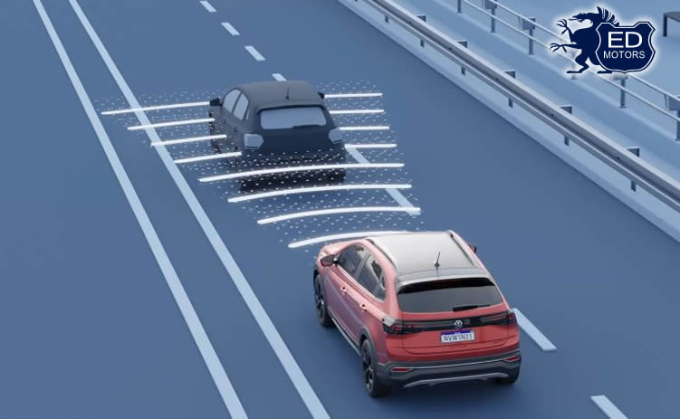 Resposta: um radar! Este equipamento tem a mesma finalidade dos utilizados em aeronaves, realizando a ‘varredura’ do trânsito à frente, detectando a presença de outros veículos e mandando constantemente informações à central eletrônica do sistema, que, a partir delas, toma as decisões de frear ou acelerar. No Nivus, este radar está posicionado atrás do novo logo da Volkswagen, na grade frontal.