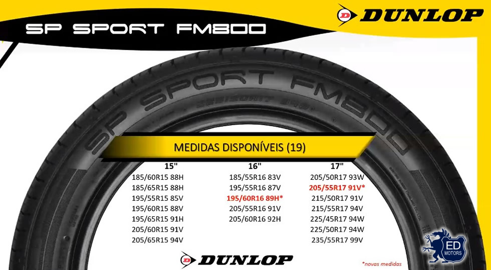Com 19 medidas disponíveis para o SP Sport FM800, a Dunlop espera ampliar a gama de oferta de pneus para automóveis compactos, sedans e SUV’s urbanos, oferecendo um produto ainda mais seguro, com melhor performance em condições de piso molhado.