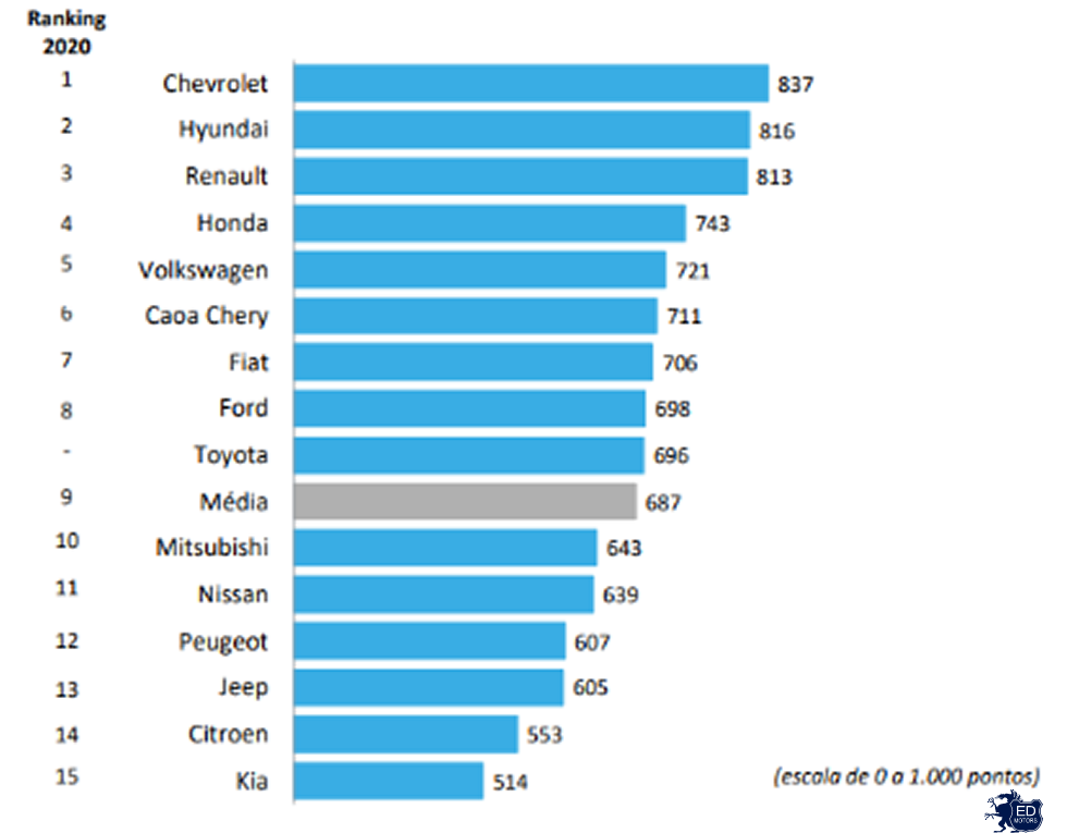 Entre as marcas de volume, a rede de concessionárias Chevrolet obteve 837 pontos em uma escala de 1000 pontos possíveis. Foram considerados os fatores e aplicados seus pesos: avaliação, captação, comunicação e rentabilidade; liderando assim o ranking de melhor performance de veículos usados do ano de 2020. A Chevrolet aparece no ranking em todos os fatores do estudo, demonstrando equilíbrio e robustez em sua performance de veículos usados. Hyundai (816 pts.) e Renault (813 pts.) também apresentaram um bom desempenho, enquanto Jeep (605 pts.), Citroen (553 pts.) e KIA (514 pts.) apareceram nas últimas posições.