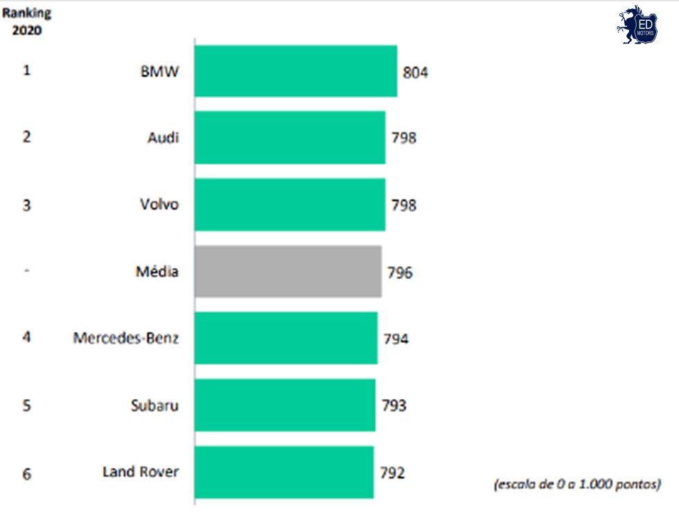 Já entre as marcas premium, a rede de concessionárias BMW obteve 804 pontos, numa escala máxima de 1000 pontos. Foram considerados os fatores e seus pesos: avaliação, captação, comunicação e rentabilidade; liderando assim o ranking de melhor performance de veículos usados premium do ano de 2020. A marca lidera o ranking em metade dos fatores do estudo, além de segunda posição no fator comunicação. Audi e Volvo também tiveram destaque na avaliação ao apresentar média de pontuação da média da indústria. Um resultado surpreendente no estudo foi o fato da Mercedes-Benz apresentar pontuação abaixo da média do mercado premium, bem como a Subaru e Land Rover.