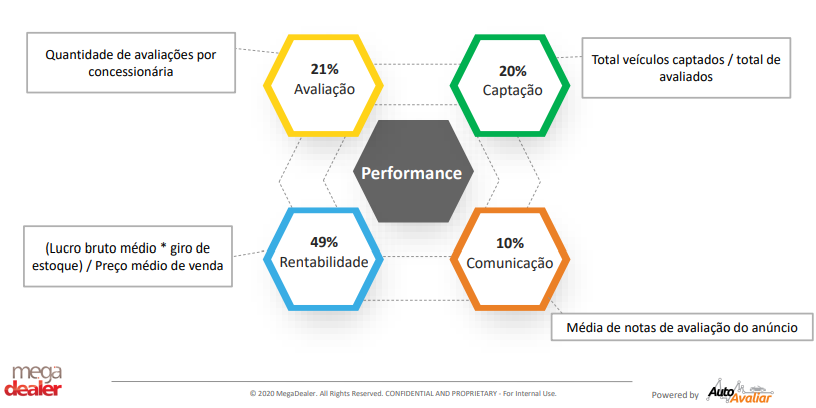 Os Fatores de Performance em Vendas de Veículos Usados são definidos da seguinte forma: Avaliação (Quantidade de avaliações por concessionária), Captação (Total veículos captados / total de avaliados), Rentabilidade ((Lucro bruto médio * giro de estoque) / Preço médio de venda) e Comunicação (Média de notas de avaliação do anúncio).