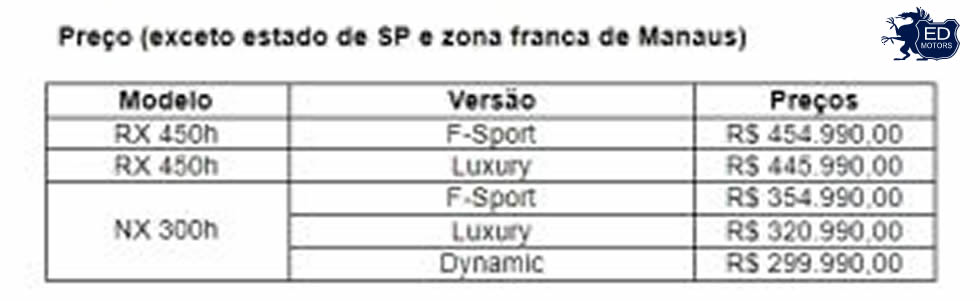As três versões ainda contemplam sistema de ar-condicionado dual zone digital, Smart Entry System e acionamento do motor por meio do Start Button. Nas versões Luxury e F-Sport, o motorista conta ainda com a tecnologia hands free para abertura do porta-malas, que funciona por meio de sensores que detectam o movimento das mãos.