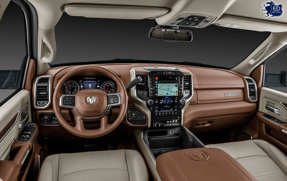 Extremamente espaçosa e bem acabada, a cabine da Ram 2500 Laramie oferece muito luxo e tecnologia, a exemplo da central multimídia com tela de toque de 12 polegadas e inúmeros recursos. Entre os destaques estão a câmera 360°, a exclusiva câmera de caçamba e o sistema de som premium Alpine com nove alto-falantes, um subwoofer e cancelamento ativo de ruídos externos.