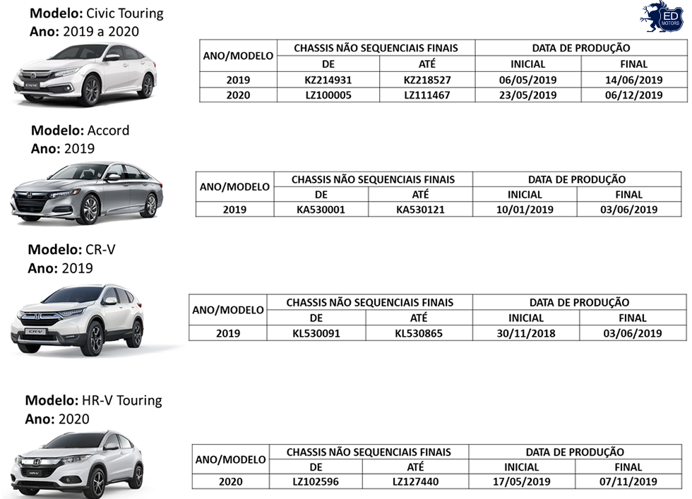 Importante: Esse comunicado se aplica aos veículos Civic Touring modelo 2019 a 2020, Accord modelo 2019, CR-V modelo 2019 e HR-V Touring modelo 2020, cujos chassis estão relacionados acima