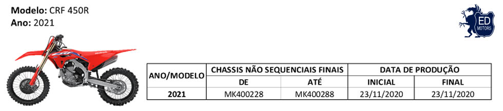 A Moto Honda da Amazônia, pautada pelo seu princípio de respeito aos clientes, convoca os proprietários do modelo CRF 450R ano modelo 2021, conforme descrição a seguir, a comparecerem a uma das concessionárias Honda, a partir do dia 31 de maio de 2021, para a substituição gratuita da corrente de transmissão.