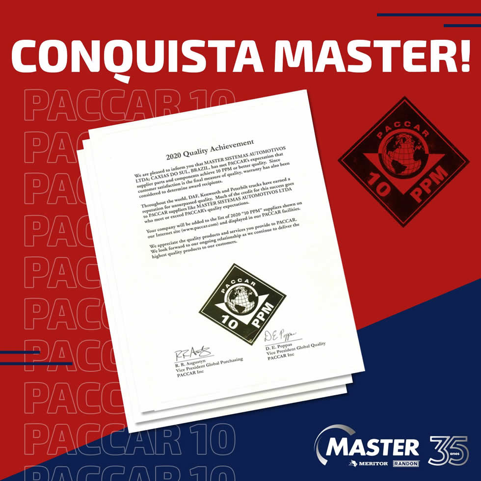 Anualmente, a Paccar concede o prêmio às fornecedoras cujo índice de PPM (partes por milhão) seja menor ou igual a 10 no ano, ou seja, empresas com até 10 peças com defeito para cada milhão de componentes enviados à companhia. Em 2020, a Master manteve o índice em zero PPM durante todo o período.