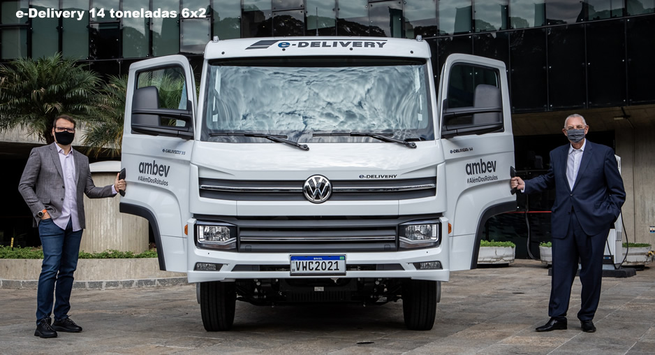 Nesta segunda-feira, Roberto Cortes, presidente e CEO da VWCO, entregou à Rodrigo Figueiredo, vice-presidente de Sustentabilidade e Suprimentos da Ambev, as chaves do primeiro caminhão elétrico do lote de cem unidades adquiridas pela cervejaria. Essa é uma iniciativa histórica e pioneira realizada pela Ambev e VWCO, que possibilitará uma frota dessa dimensão de caminhões elétricos circulando pelas ruas do país até o fim de 2021. Os veículos fazem parte do plano da Ambev de ter 1.600 modelos VW com essa tecnologia zero emissões na sua frota parceira até 2025. Este será o primeiro caminhão elétrico Volkswagen a operar nas ruas, não mais como um protótipo. Trata-se de um e-Delivery 14 toneladas 6×2.
