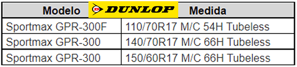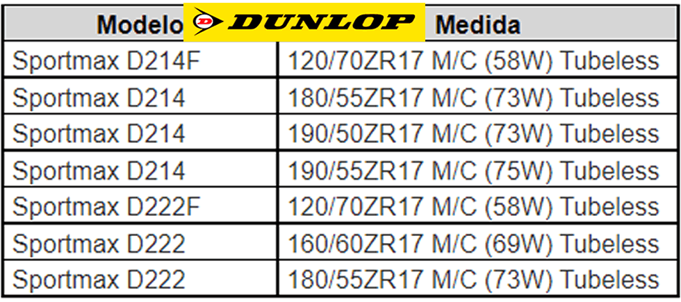 Importados das fábricas da Dunlop, principalmente do Japão e da Tailândia, os pneus trazem toda a experiência e tecnologia da marca que é referência no segmento ao redor do mundo, além de marcar presença em competições de motovelocidade como Moto 2 e Moto 3.