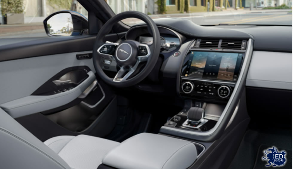 A manopla de câmbio, como já é conhecida no modelo F-PACE há pouco lançado, possui um novo design, com acabamentos feitos com costura “bola de críquete” e metal, projetado com precisão para um manuseio mais confortável e preciso. O foco na alta qualidade dos materiais estende-se por toda a cabine, com detalhes metálicos nos alto-falantes e nas saídas de ar-condicionado. O veículo também ganhou um novo volante mais moderno e intuitivo, com design inspirado no elétrico I-PACE. Teto solar panorâmico e bancos dianteiros elétricos com 12 ajustes completam o interior requintado do novo Jaguar E-PACE.