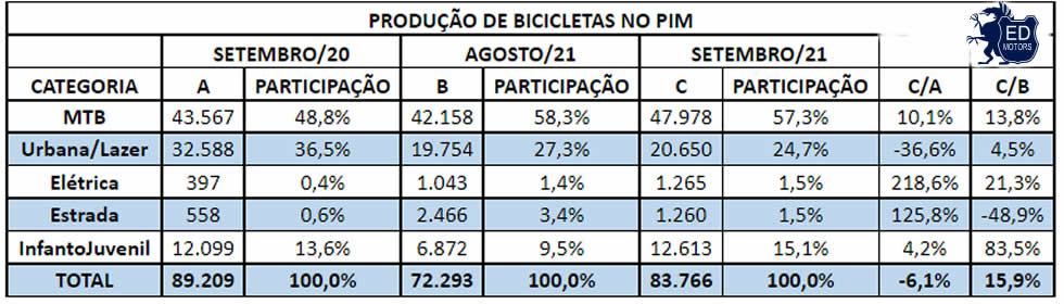 Com 47.978 unidades e 57,3% do volume total fabricado, a Moutain Bike (MTB) liderou o ranking das categorias mais produzidas em setembro. Em segundo lugar, ficou a Urbana/Lazer (20.650 unidades e 24,7% do volume fabricado) e em terceiro, a Infanto-Juvenil (12.613 bicicletas e 15,1%).