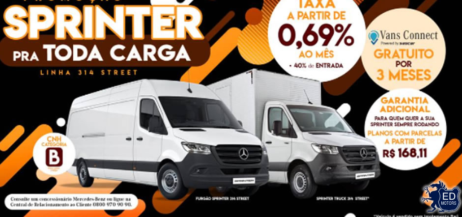 A Mercedes-Benz Vans divulga, neste mês de novembro, a ação “Sprinter Pra Toda Carga”, que oferece aos clientes condições especiais na compra da linha 314 Street. Os modelos contemplados são o Furgão e o Sprinter Truck, que podem trafegar em áreas mais restritas a veículos pesados e apresentam a possibilidade de serem conduzidos com carteira de habilitação de categoria B.