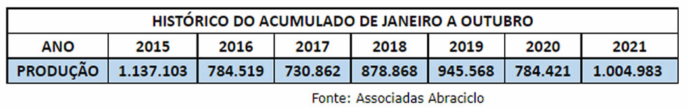Em outubro, saíram das linhas de montagem 108.456 motocicletas, resultado muito similar às 108.931 unidades produzidas no mês anterior. Em relação ao mesmo mês de 2020, houve alta de 19,3% (90.880 unidades).