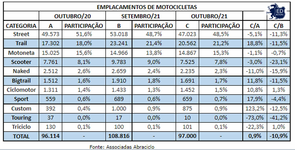 Os licenciamentos em outubro somaram 97.000 unidades. O volume é 10,9% inferior ao registrado em setembro (108.816 motocicletas) e 0,9% maior na comparação com as 96.114 motocicletas emplacadas no mesmo mês do ano passado.