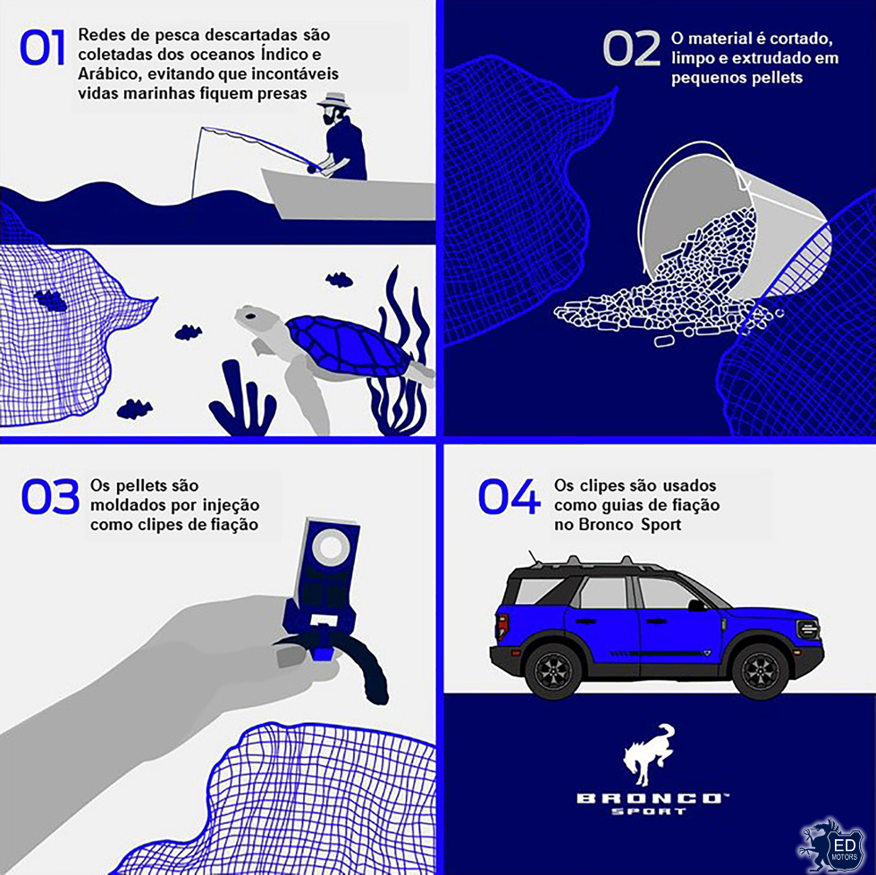 A Ford é a primeira montadora a usar plástico 100% reciclado dos oceanos na produção de peças automotivas. O material está sendo empregado nos clipes de fixação do chicote elétrico do Bronco Sport, o primeiro modelo a estrear a novidade.